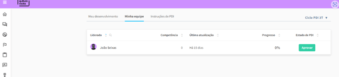 3. Na aba "Minha equipe" ele irá ter uma visão geral de todos os seus liderados, onde ele poderá ter acesso a área de desenvolvimento de cada um, e também onde ele poderá aprovar o PDI que foi proposto pelo colaborador;