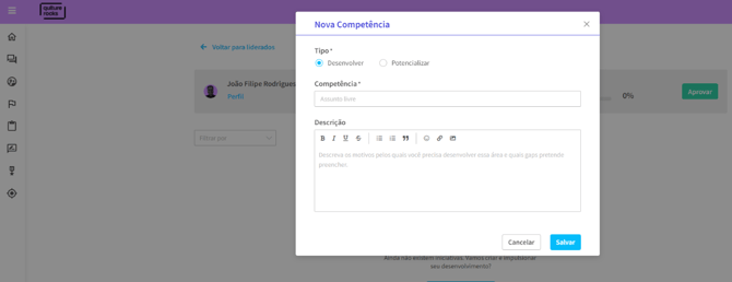 Obs: Vale ressaltar que o nome "nova competência" pode ser alterável dependendo do que foi configurado como "Label" para a área de desenvolvimento. Neste caso estava configurado como "competência".