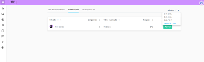 6. Porém o líder também pode ter uma visão mais macro do que está acontecendo com sua equipe através de relatórios, basta o líder clicar no canto superior direito, onde estará o nome do ciclo atual, e escolher a opção "Gerenciar ciclos"