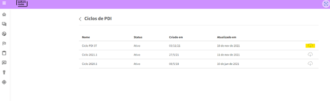 7. O líder será redirecionado para uma nova página, a qual ele poderá baixar relatórios de todos os ciclos que já foram realizados dentro da plataforma, basta escolher um ciclo e clicar no ícone que deixamos grifado em "amarelo";