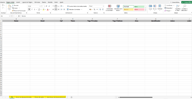 Basta navegar pelas três abas que foram grifadas em amarelo da planilha em excel, que ficam no inferior da tela, "PDI, Áreas de desenvolvimento, Ações, Sem áreas de desenvolvimento", nessas abas o líder encontrará as informações listadas acima, e demais informações.